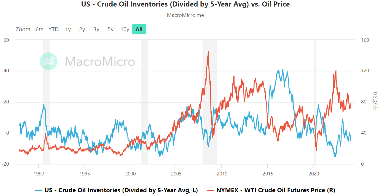 Divided by 5-Year Avg (Chia cho trung bình 5 năm) so với giá dầu: Đây là việc so sánh lượng tồn kho hiện tại với mức trung bình của tồn kho trong vòng 5 năm trở lại. Việc chia cho trung bình 5 năm giúp loại bỏ các biến động ngắn hạn và tạo ra một cái nhìn dài hạn về xu hướng tồn kho.