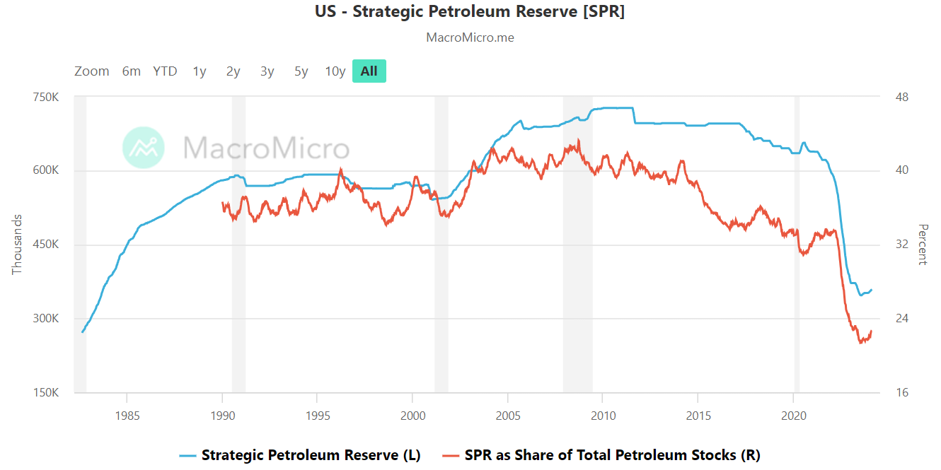 Cuộc khủng hoảng dầu mỏ đầu tiên nổ ra vào năm 1973 do lệnh cấm vận dầu mỏ của các nước Ả Rập áp đặt. Lệnh cấm vận khiến giá dầu thô tăng vọt, ảnh hưởng nặng nề đến nền kinh tế Mỹ. Để đáp lại, Tổng thống Hoa Kỳ khi đó Gerald Ford đã ký Đạo luật Bảo tồn và Chính sách Năng lượng (EPCA), thành lập Cục Dự trữ Dầu khí Chiến lược (SPR). Quốc hội ban đầu cho phép mục tiêu dự trữ cuối cùng của SPR là 500 triệu thùng dầu thô, được mở rộng lên 750 triệu thùng vào năm 1978, 1 tỷ thùng vào năm 2005 và trong năm 2023 đã giảm xuống còn khoảng 350 triệu thùng.